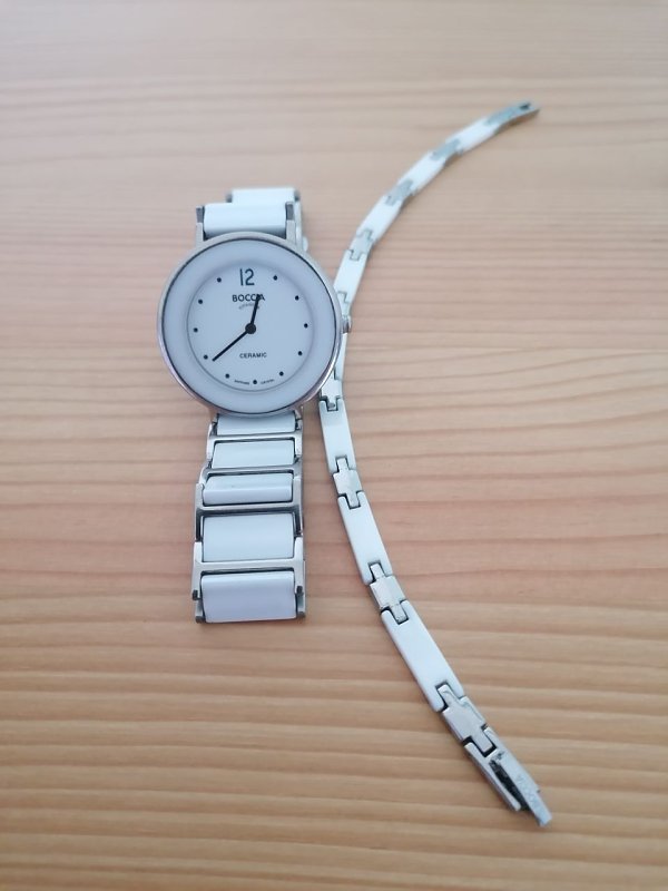Biete eine Damenuhr von Boccia in weiß und Keramik, daher für Allergiker gut geeignet.Mit dabei das passende Armband.