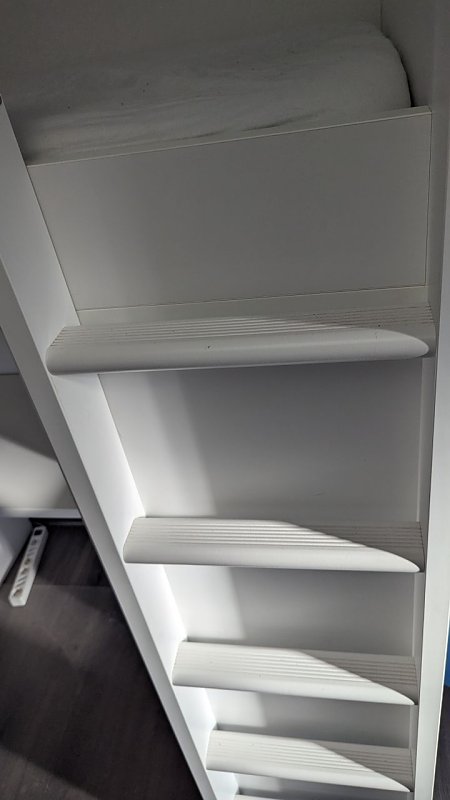 Das Bett hat leichte Gebrauchsspuren auf den Stufen und an der inneren linken Seitenwand, siehe Fotos.