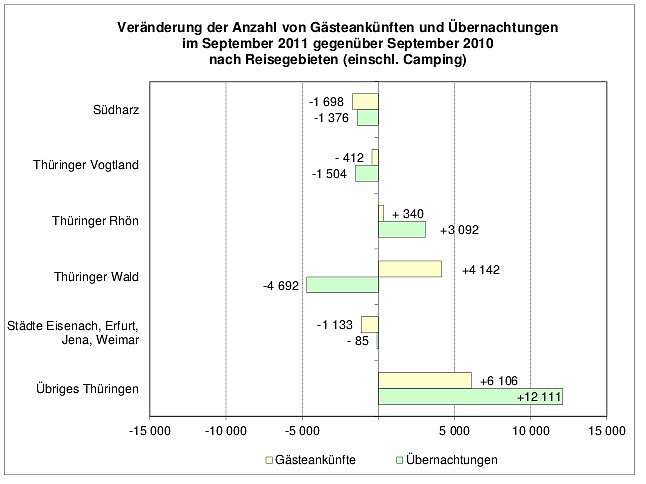 In den Thüringer Reisegebieten war im September 2011 keine einheitliche Tendenz zu erkennen. Im größten der Thüringer Reisegebiete, dem Thüringer Wald, stand einem Rückgang der Übernachtungen um 1,2 Prozent ein Anstieg der Gästezahlen um 3,0 Prozent gegenüber. Im Reisegebiet der Städte (Eisenach, Erfurt, Jena und Weimar) lagen die Übernachtungszahlen aufdem Niveau des Vorjahresmonats, während die Zahl der Gästeankünfte um 1,0 Prozent zurückging.
