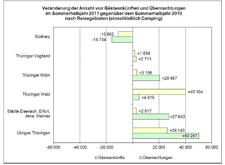 Der Anstieg der Übernachtungszahlen resultierte im Sommerhalbjahr 2011 hauptsächlich aus Zuwächsen im Reisegebiet Thüringer Rhön (+20 457 Übernachtungen), im Reisegebiet der Städte Eisenach, Erfurt, Jena und Weimar (+27 643 Übernachtungen) sowie im Reisegebiet Übriges Thüringen (+50 267 Übernachtungen). Der Thüringer Wald, das größte Thüringer Reisegebiet, konnte zwar den mit Abstand höchsten Anstieg der Gästezahlen verbuchen (+40 104), allerdings blieben die Gäste im Durchschnitt nicht so lange wie im Sommerhalbjahr 2010, sodass die Zahl der Übernachtungen nur geringfügig über dem Niveau des letzten Sommerhalbjahres lag (+4 915).