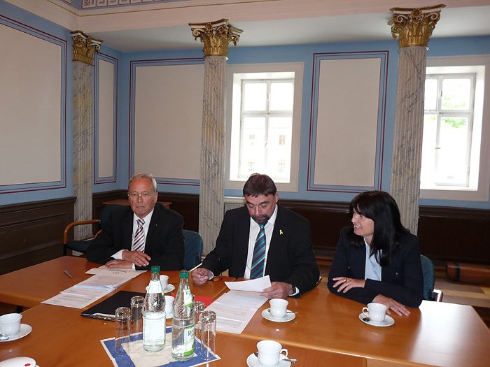 In der heutigen Pressekonferenz erklärten Karl-Heinz Langhorst (li.), Geschäftsführer der Stadtmarketing GmbH, Bürgermeister Joachim Kreyer (CDU) und seine 1. Beigeordnete Cornelia Kraffzick (SPD), was man vom Thüringentag erwarten wird. Man rechnen mit 150.000 Besuchern, die hauptsächlich Tagesgäste sein werden, vermutet Langhorst. Der größte Ansturm wird für den Sonntag erwartet. Dann findet auch der große Festumzug statt. Allein für den Festumzug rechne man mit fast 4.000 Teilnehmern, was noch mal das doppelte von dem wäre, als voriges Jahr die große Bergparade anlässlich des Thüringer Bergmanstages durch Sondershausen zog.