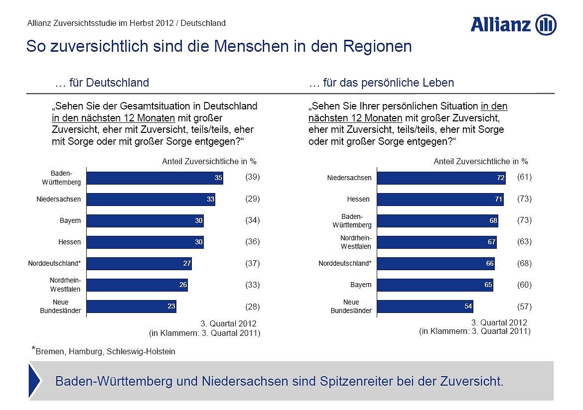 Im dritten Quartal 2012 wurde zusätzlich zu den kontinuierlich durchgeführten Interviews der Allianz Zuversichtsstudie erneut die Stimmung der Menschen in den größten Städten Deutschlands mit mindestens 500.000 Einwohnern erhoben. Das sind: Berlin, Bremen, Dortmund, Dresden, Düsseldorf, Essen, Frankfurt, Hamburg, Hannover, Köln, Leipzig, München, Nürnberg und Stuttgart.Im Vergleich zu den Befragungen vor einem Jahr haben sich folgende Veränderungen im Stimmungsbild der 14 Großstädte ergeben: In Berlin hat die Zuversicht für Deutschlands Zukunft den stärksten Dämpfer erhalten. Nur noch 27 Prozent der Einwohner sind optimistisch, wenn sie an die künftige Entwicklung Deutschlands denken. Der Wert ist im Vergleich zum Herbst 2011 um 15 Prozentpunkte zurückgegangen. Das bedeutet für die Bundeshauptstadt einen Absturz vom zweiten auf den zwölften Platz im Städte-Ranking der Zuversicht. Nur in Köln hat sich ein ebenso radikaler Stimmungsumschwung vollzogen. Hier ist die Zuversicht für Deutschland binnen Jahresfrist von 43 auf 28 Prozent gesunken. Die Rhein-Metropole rutscht damit vom ersten auf den zehnten Platz.