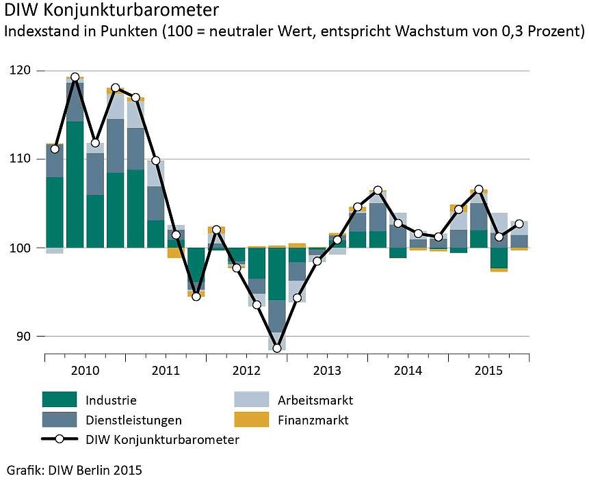 Die Lage auf dem deutschen Arbeitsmarkt bleibt günstig: Der Beschäftigungsaufbau setzt sich bei spürbaren Lohnzuwächsen fort. „Der private Verbrauch wird daher wohl weiter merklich ausgeweitet werden, allerdings mit leicht abnehmendem Tempo, denn der kaufkraftsteigernde Effekt der gesunkenen Energiepreise fällt im Schlussquartal weg“, sagt Simon Junker, DIW-Experte für die Konjunktur in Deutschland. Unter dem Strich werden die konsumnahen Dienstleister die deutsche Konjunktur weiterhin deutlich anschieben.