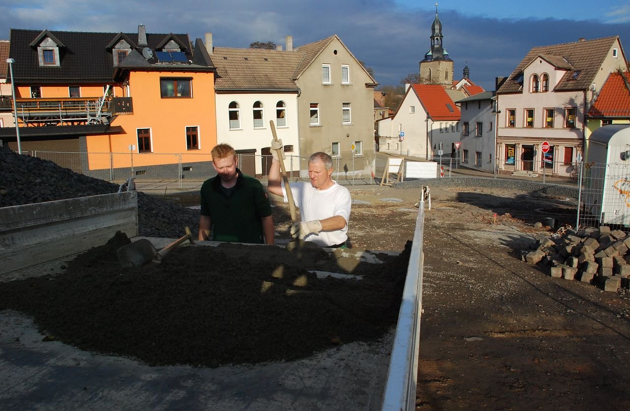 Das Wetter ist ihnen wohl gesonnen: Lehrling Philipp Hartlepp und Landschaftsgestalter Manfred Becker von der Dammann Kulturtechnik GmbH, kommen gut voran bei der Neugestaltung der Freifläche in Hettstedt, Obertor 4. Ende November soll bereits die Übergabe erfolgen.