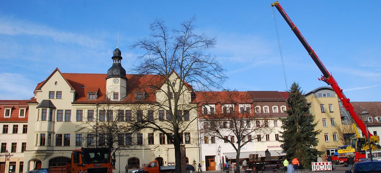 Er steht! Der Hettstedter Weihnachtsbaum. Seit heute Vormittag, dreiviertel elf. Es ist eine schön gewachsene Edeltanne. Sie steckt anderthalb Meter tief im Boden und guckt 13 Meter oben heraus. Ihr bleiben sechs Wochen, die Hettstedter und ihre Gäste zu erfreuen.Heute Morgen wurde der Baum in Sylda geschlagen. Mit dabei außer die Männer des Bauhofes der Stadt Hettstedt: ein Kran, an dessen Ausleger riesige Gurte befestigt sind, in denen sich nach dem Absägen der Baum fängt. Die Tanne ist ein Geschenk der Familie Bock an die Stadt Hettstedt. Überhaupt: Hettstedt bekommt ziemlich häufig seine Weihnachtsbäume geschenkt. Bernd Carpy, Leiter des städtischen Bauhofes, meint: Ja. Da gibt es keinen Mangel. Wir haben sogar den Baum für das kommende Jahr schon sicher. Im Grunde darf jeder Interessierte, der ein gut gewachsenes, sich zum Weihnachtsbaum eignendes Exemplar besitzt, der Stadt dieses anbieten. Allerdings, so Bernd Carpy: Das sollte man sich aber nicht kurz vor Weihnachten überlegen. Dann ist es zu spät. Auf die Frage, ob der Baum vom vorigen Jahr nicht viel größer war, antwortet er: Der war vielleicht ein, zwei Meter höher. Aber dafür hatte er einen riesigen Umfang. Wir mussten voriges Jahr den gesamten Freimarkt rechts und links sperren, um ihn ohne Schaden auf den Markt zu bekommen.