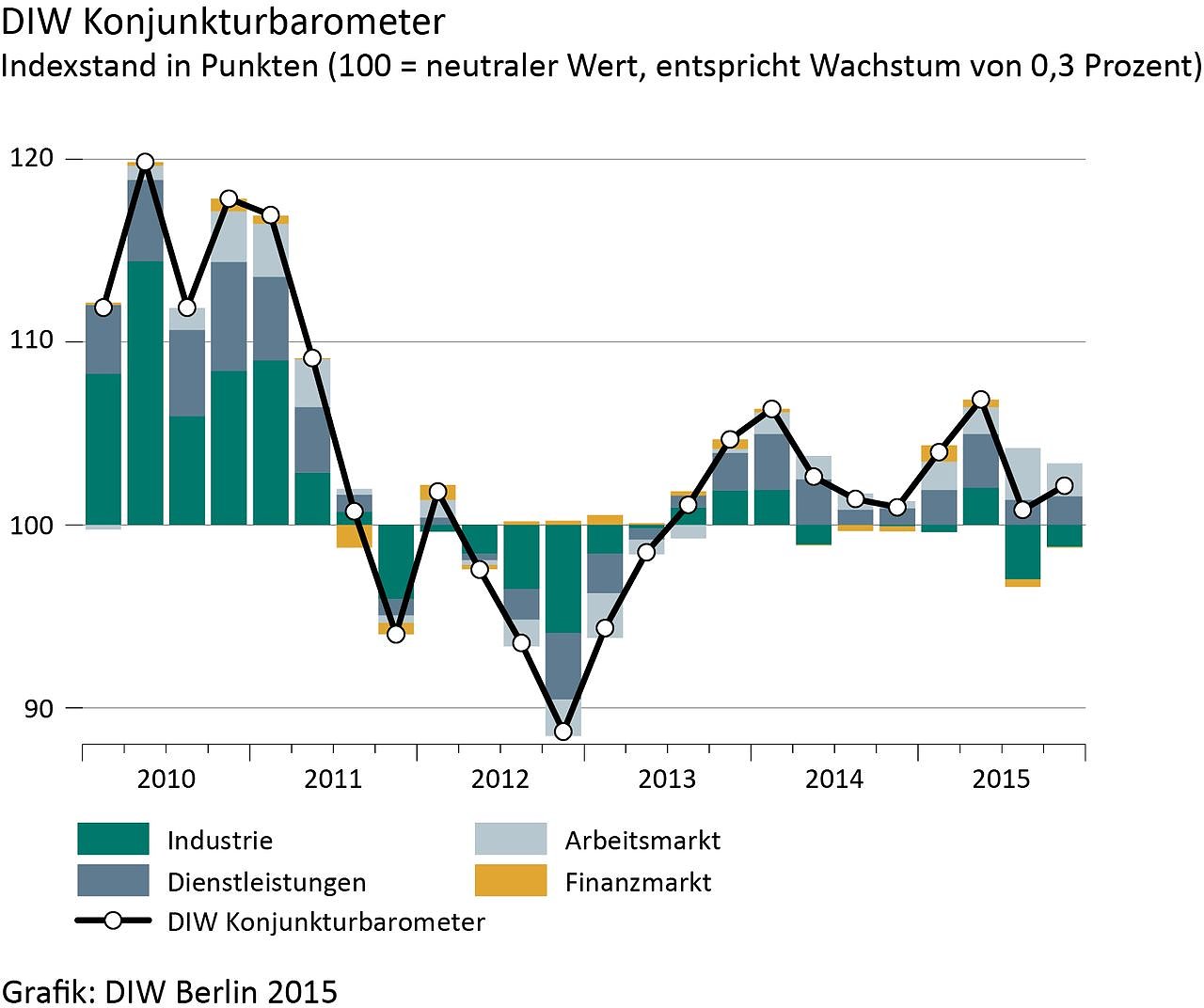 Der Indexstand liegt mit nun 102 Punkten weiterhin über dem Schwellenwert von 100 Punkten, der ein durchschnittliches Wachstum der deutschen Wirtschaft anzeigt, und auch über dem Wert für das dritte Quartal im Vergleich zum Oktober ist er aber um einen Punkt gesunken.