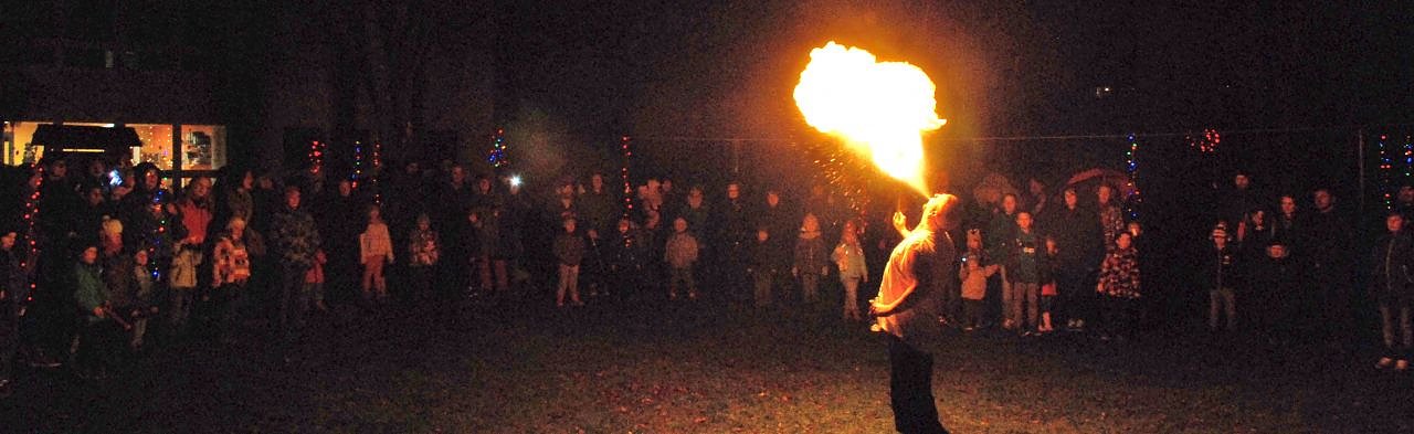 Verströmten die Feuerschalen schon wohlige Wärme, so wurde es erst richtig heiß beim Highlight des Abends: der Feuershow. Carsten Spira aus Mansfeld, der mit dem Feuerdrachen kämpfte, musste die verschiedensten Abenteuer durchstehen. Immer wieder erklangen begeisterte Kinderstimmen, die ein Noch einmal forderten, sobald er Feuer spie. Wenn der Feuermeister jedoch an seinem Hinterteil feurigen Dampf abließ, war die Begeisterung der Kinder kaum noch zu bremsen. Allerdings: Über diesen Gag mussten auch die Erwachsenen lachen.