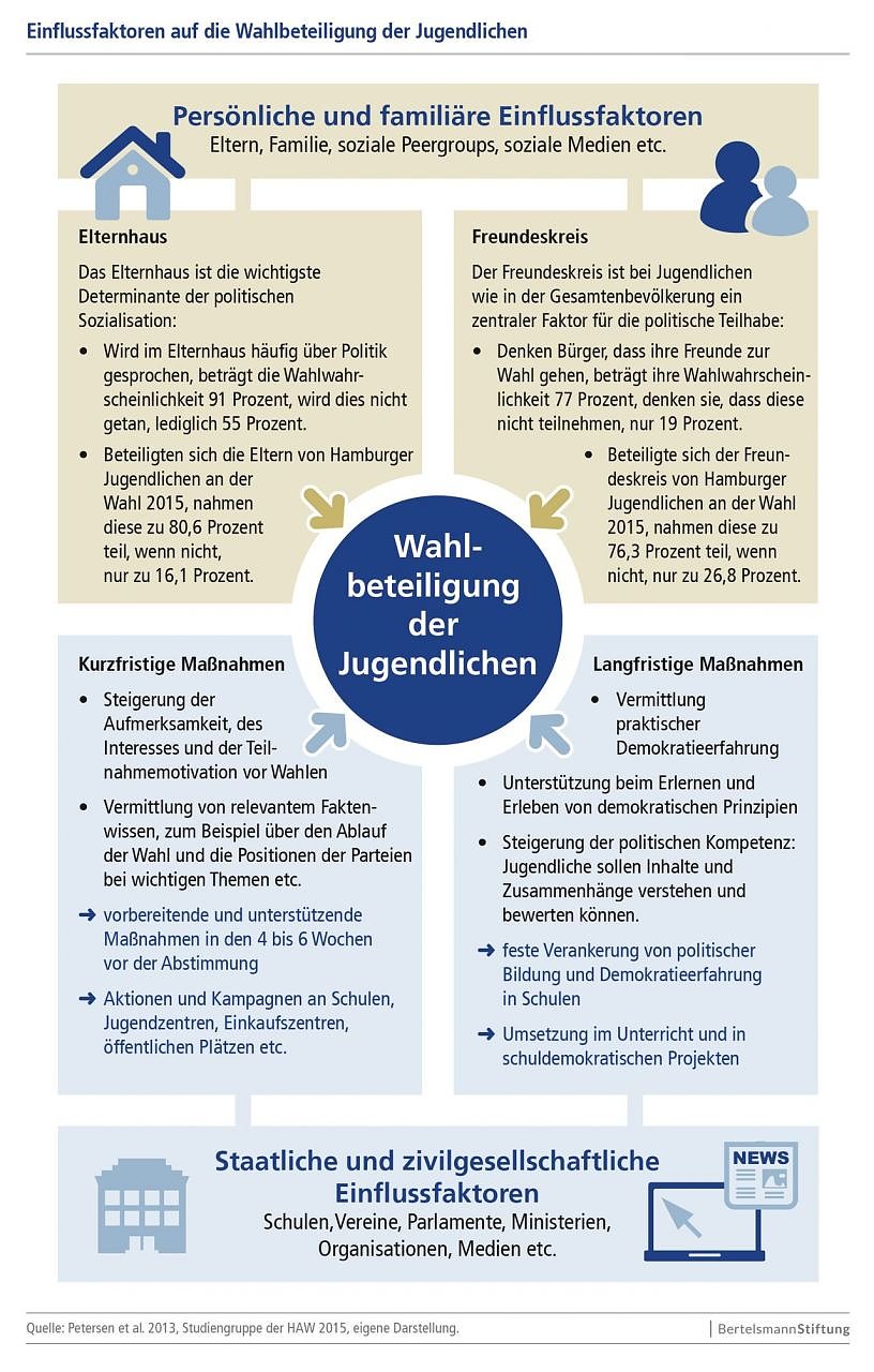 Zusätzlich wurden für die Studie die Ergebnisse einer repräsentativen Bevölkerungsumfrage berücksichtigt, die das Institut für Demoskopie Allensbach im Auftrag der Bertelsmann Stiftung zum Thema „Wählen ab 16“ im September 2015 durchgeführt hat.