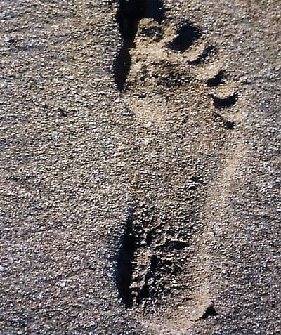 Autor: redDas Foto von dem Fußabdruck finde ich faszinierend. Für mich sah es auf den ersten Blick so aus, als wäre der Fußabdruck erhaben. Das kann doch nicht sein! Fußabdrücke sinken immer ein! Erst auf den zweiten Blick wirkte es dann doch mit dem Schatten am Zeh und der Ferse so, als würde er ganz normal einsinken. Was sehen Sie?
