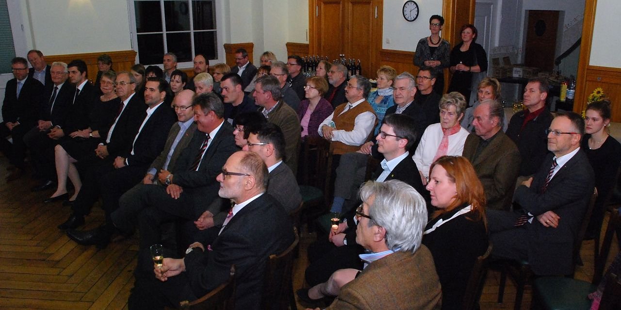 Ein für die wirtschaftliche Entwicklung des Landkreises unerlässliches Publikum saß in der früheren Schalterhalle des Bahnhofes, darunter der Vorstandsvorsitzende der Sparkasse Mansfeld-Südharz, Hans Ulrich Weiss (r.) und Landrätin Dr. Angelika Klein (vordere Reihe 3. von vorn). (Foto: Jochen Miche)