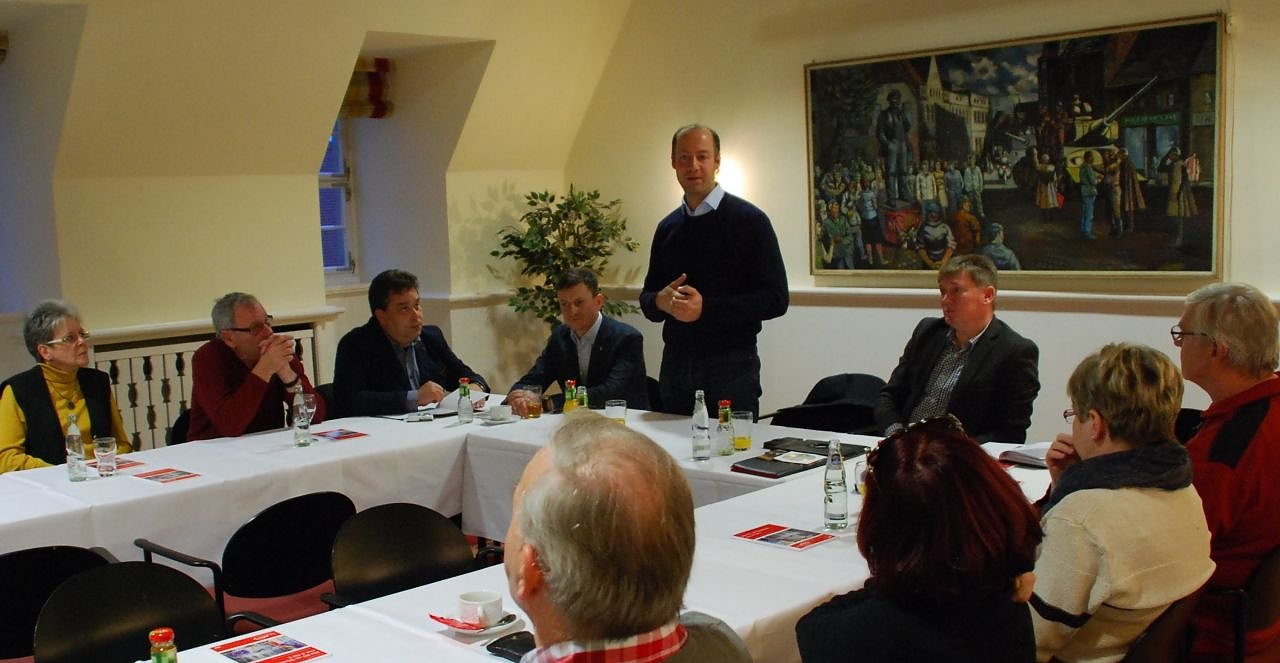 Der Europaabgeordnete Arne Lietz (stehend) neben dem Landtagsabgeordneten des Mansfelder Landes, Norbert Born (rechts) im Eisleber Hotel "Graf von Mansfeld". (Foto: Jochen Miche)