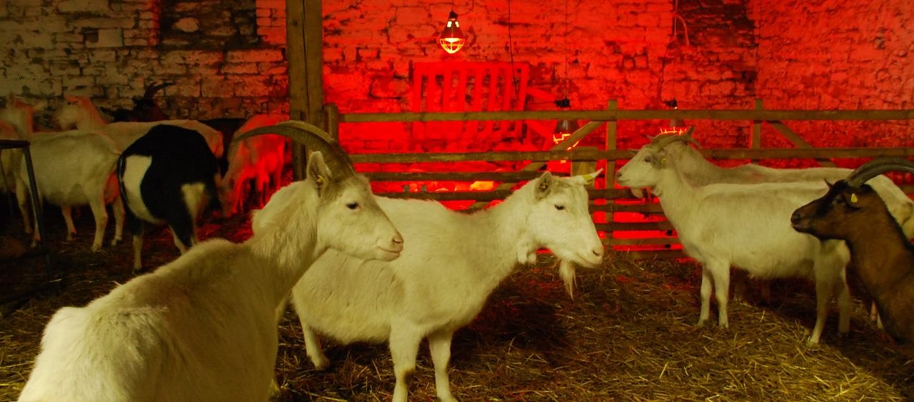 Blick in einen Ziegenstall in Pfeiffhausen. Im Hintergrund Rotlicht, unter dem sich die Lämmer (etwa 100 davon leben in Pfeiffhausen) wohl fühlen können. (Foto: Jochen Miche)