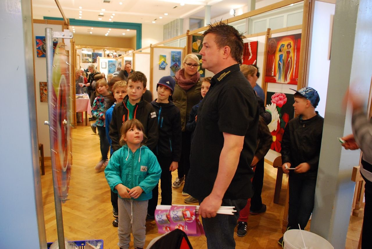 Dank einer kunstinteressierten Schulleiterin und engagierter Lehrerinnen bekamen alle Helbraer Grundschulkinder heute Gelegenheit, klassenweise die Kunstausstellung zu besuchen. Der Rundgang entlang und durch die von der Helbraer Firma Lignum GmbH Messe und Ladenbausysteme errichteten Kunsträume und die Begegnung mit den Künstlern glich einem Abenteuer.