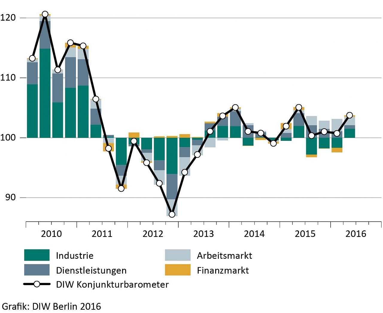 Vor allem die Industrie ist nach einem schwächeren zweiten Halbjahr 2015 gut in das Jahr 2016 gestartet, sagt DIW-Konjunkturchef Ferdinand Fichtner: Auch im zweiten Quartal dürfte das Produktionswachstum – vor allem wegen der Exporte – nochmal recht kräftig ausfallen.