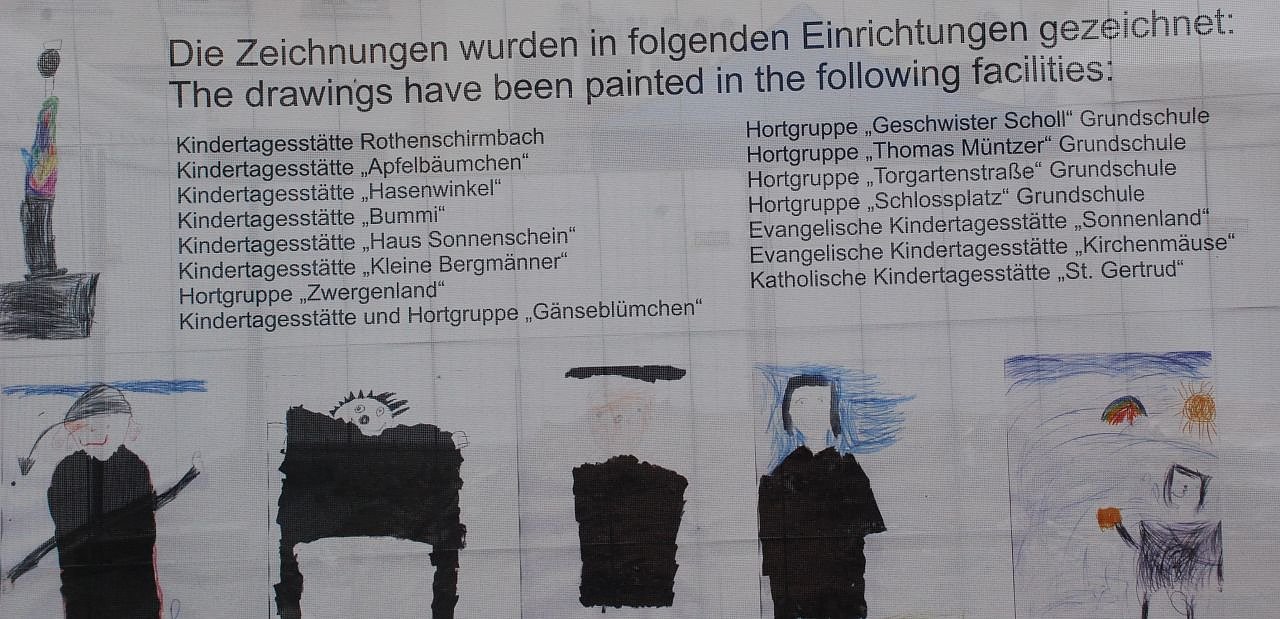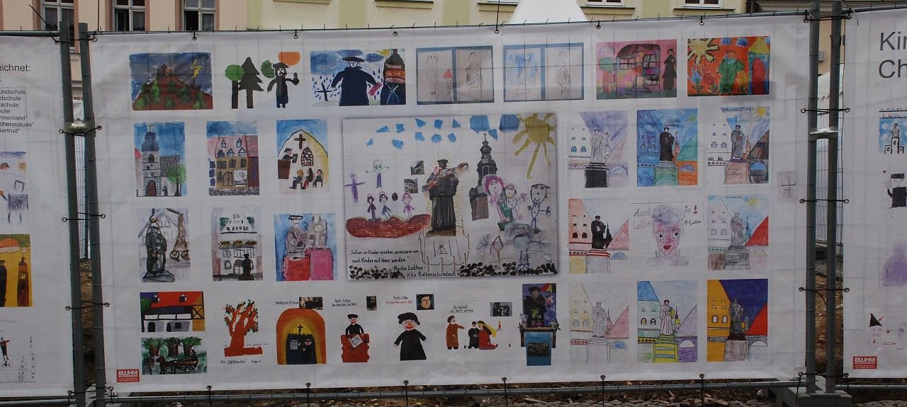 die Sicht zur Baustelle eingeschränkt. Die Stabstelle Wirtschaft/ Schulen, Jugend, Sport/ Fördermittelkoordination rief in diesem Zusammenhang in den Kindertagesstätten und Hortgruppen auf, Bilder zum Thema Lutherdenkmal zu gestalten. Daraufhin erreichten die Stadtverwaltung ca. 120 Bilder. Die Bilder wurden gescannt und auf insgesamt 3 Planen gedruckt.