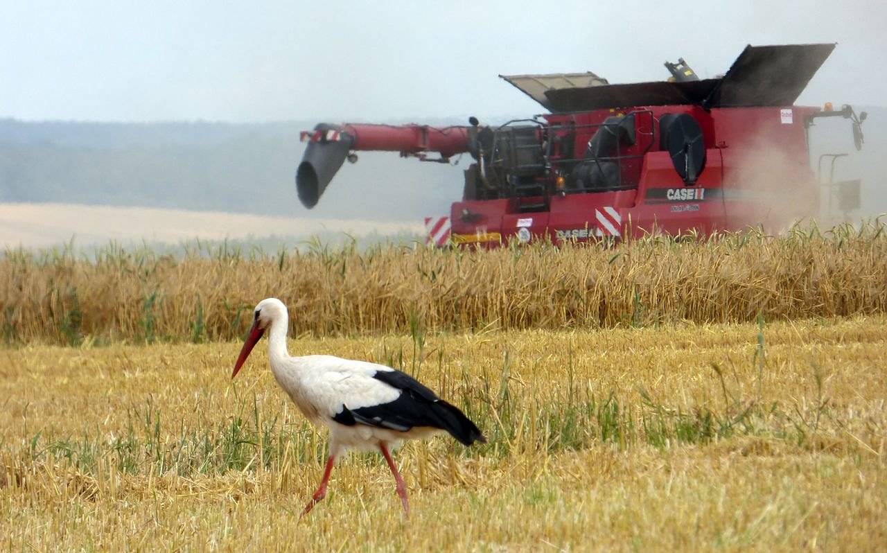 Da schreitet Meister Adebar seelenruhig über ein Feld im Landkreis Nordhausen. Dass da quasi nebenan noch geerntet wird, scheint in nicht zu stören...