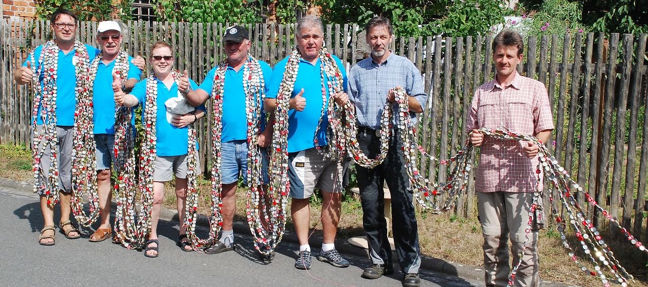 Zur Kronkorkenparty heute ab 20 Uhr wird ein neuer Weltrekord verkündet: Mit 3030 Meter und 44,6 Zentimeter Länge wurde in Bornstedt die "Längste aus Flaschenverschlüssen bestehende Kette der Welt" gefertigt, ausgelegt und gemessen! Dieser Weltrekord krönt Teil 1 des Jubiläums "111 Jahre Rad- und Freizeitsport", das an diesem Wochenende gefeiert wird. Doch mit der Flaschenverschlusskette nicht genug, startet morgen um 15 Uhr bereits der zweite Weltrekordversuch: 111 Kunstradfahrer sind auf Rädern zu erleben.