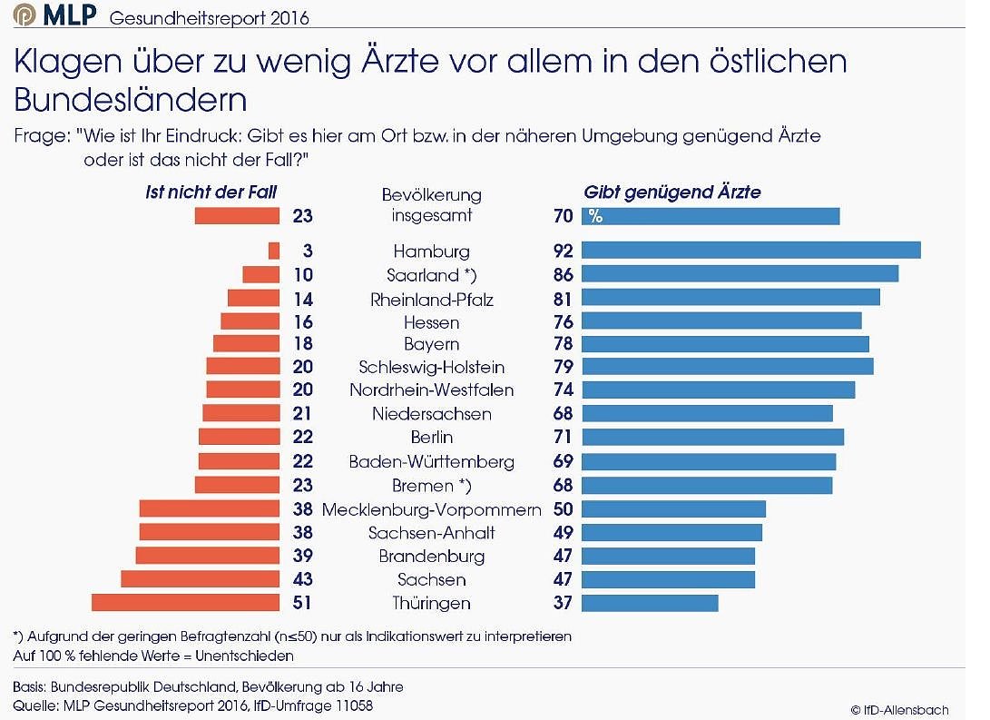 Vor allem in Brandenburg hat eine Mehrheit der Bevölkerung (43 Prozent) das Gefühl, dass sich der Arzt nicht ausreichend Zeit für sie nehmen konnte. In Rheinland-Pfalz gibt dies nur jeder Vierte an. Besonders in Berlin (60 Prozent) muss die Bevölkerung lange auf einen Arzttermin warten, während dies in Rheinland-Pfalz nur 47 Prozent angeben. 48 Prozent der niedergelassenen Ärzte im ländlichen Raum berichten bereits heute von einem regionalen Ärztemangel und spüren dessen Auswirkungen (37 Prozent) direkt bei der Versorgung der Patienten. Vor allem in Thüringen (51 Prozent) klagt die Bevölkerung über zu wenige Ärzte. 59 Prozent der niedergelassenen Ärzte berichten zudem von Schwierigkeiten bei der Rekrutierung von qualifiziertem Praxispersonal. Drei Viertel der Ärzte in ländlichen Regionen rechnen mit Schwierigkeiten bei der Suche nach einem Nachfolger für ihre Praxis.