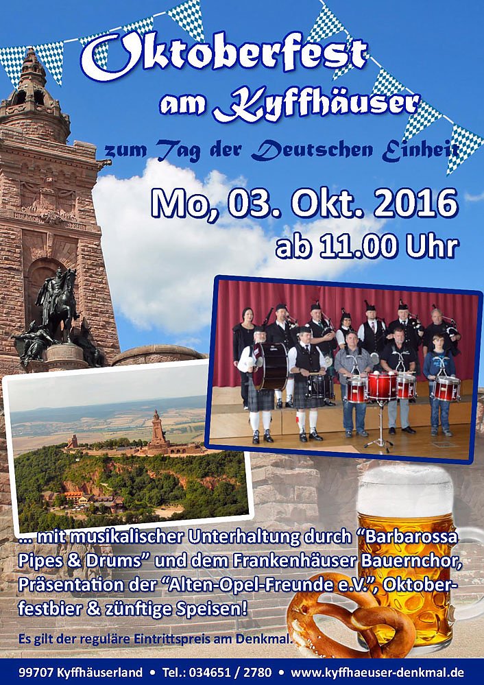 Autor: khhAb 11.00 Uhr beginnt das nächste Oktoberfest zum Tag der Deutschen Einheit statt. Auf der Terrasse vor dem Kaiser Wilhelm Denkmal können Sie zünftige Musik mit der Bauernchor aus Bad Frankenhausen erleben.