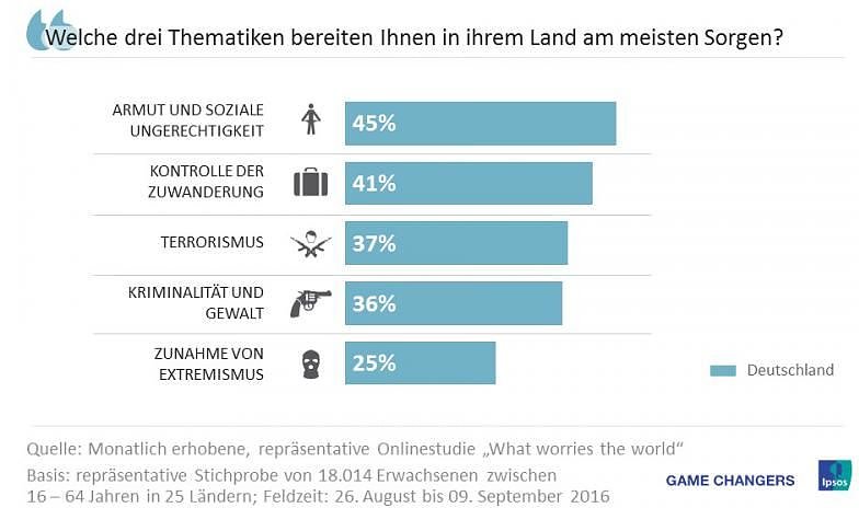 An dritter Stelle der größten Sorgen steht bei den Bundesbürgern derzeit der Terrorismus. Mehr als ein Drittel (37%) zählt dieses Thema zu den drei wichtigsten Angelegenheiten. In der Türkei (76%) und Frankreich (55%) belegt Terrorismus den Spitzenplatz der Sorgen der Bevölkerung.Darüberhinaus beschäftigt Kriminalität und Gewalt im eigenen Land mehr als ein Drittel der Deutschen (36%). Ein Viertel (25%) fürchtet eine Zunahme von Extremismus in Deutschland.