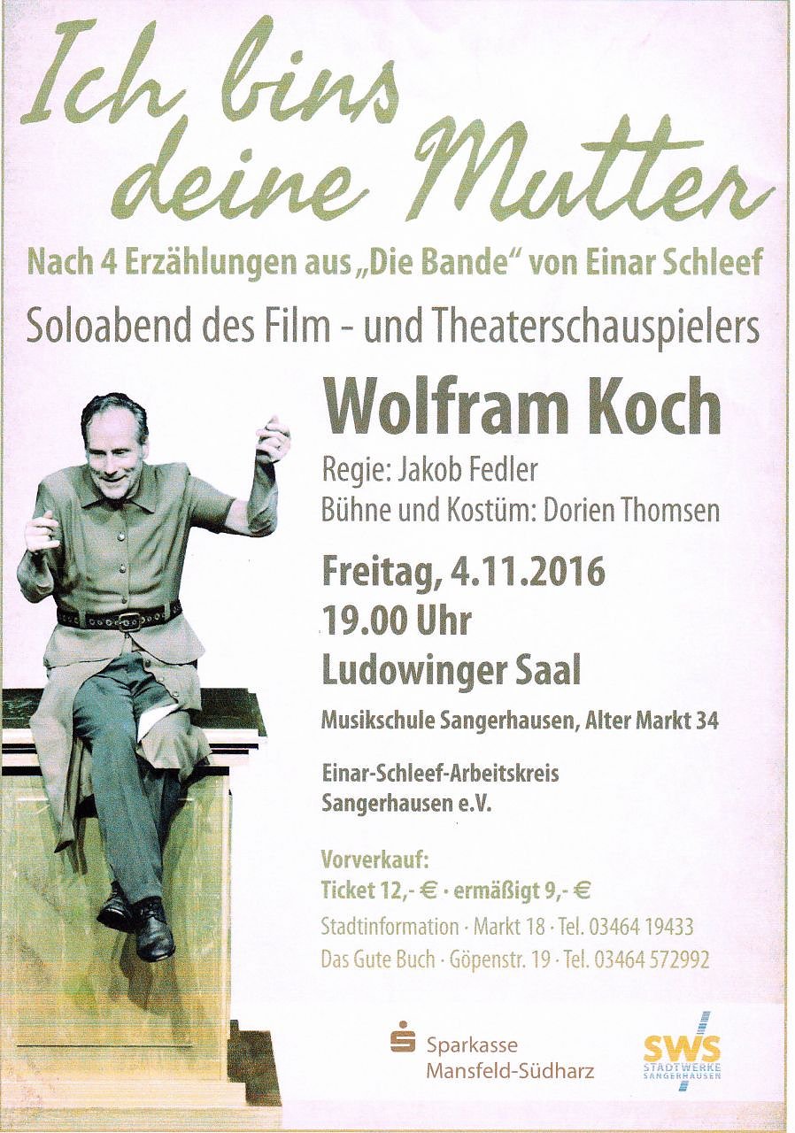 Autor: bwiWolfram Koch präsentiert in seinem Soloprogramm vier Erzählungen aus Einar Schleefs Die Bande.