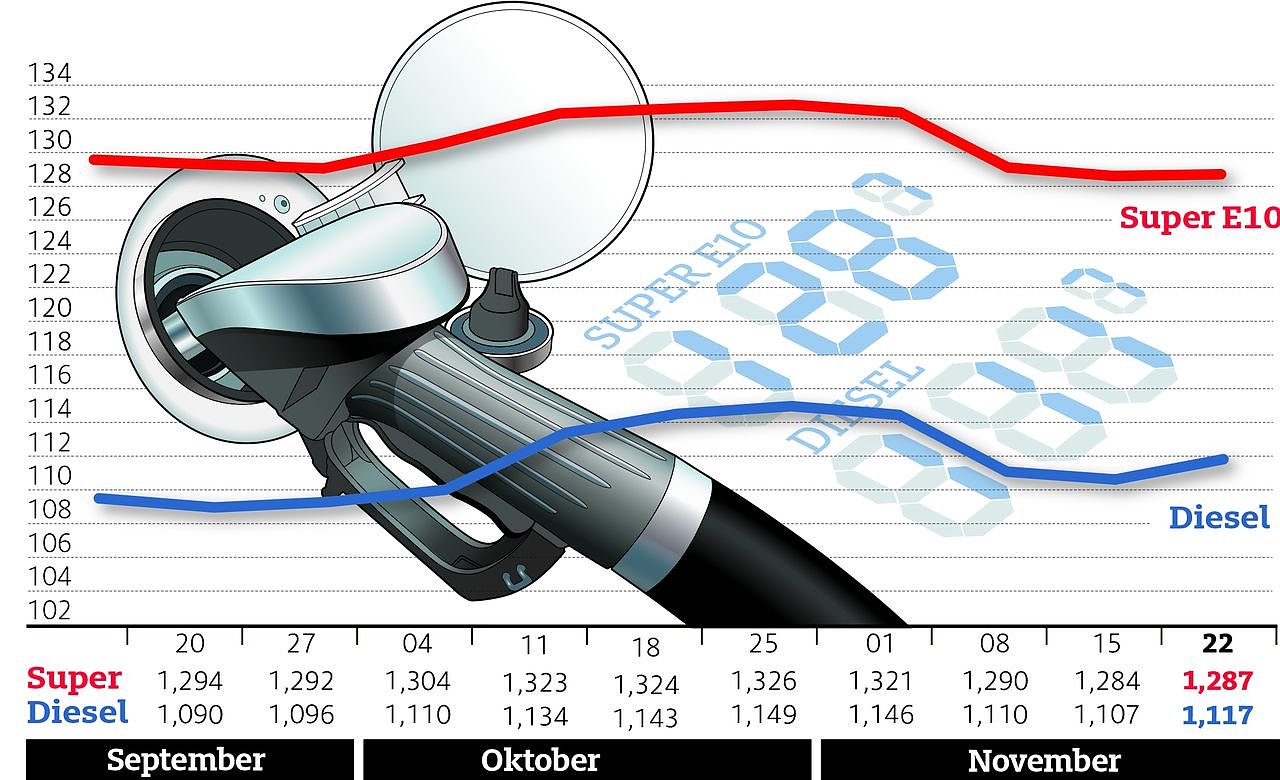 Gegenüber vergangener Woche ist dies ein Anstieg von 0,3 Cent. Diesel-Kraftstoff hat sich binnen Wochenfrist um einen Cent verteuert und kostet jetzt im Durchschnitt 1,117 Euro.