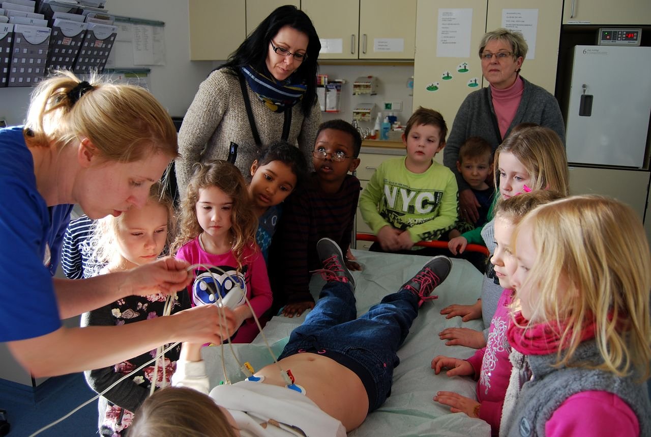 Am 19. Januar besuchten 12 Kinder aus der Eisleber Kindertagesstätte Apfelbäumchen in der Helbraer Straße mit ihren Erzieherinnen die Klinik. Zuerst zeigte Schwester Andrea den Kleinen die Notaufnahme. Ganz gespannt sahen sie sich die vielen Geräte an, ließen sich ein EKG anlegen und horchten mit großen Augen ihrem eigenen Herzschlag zu.