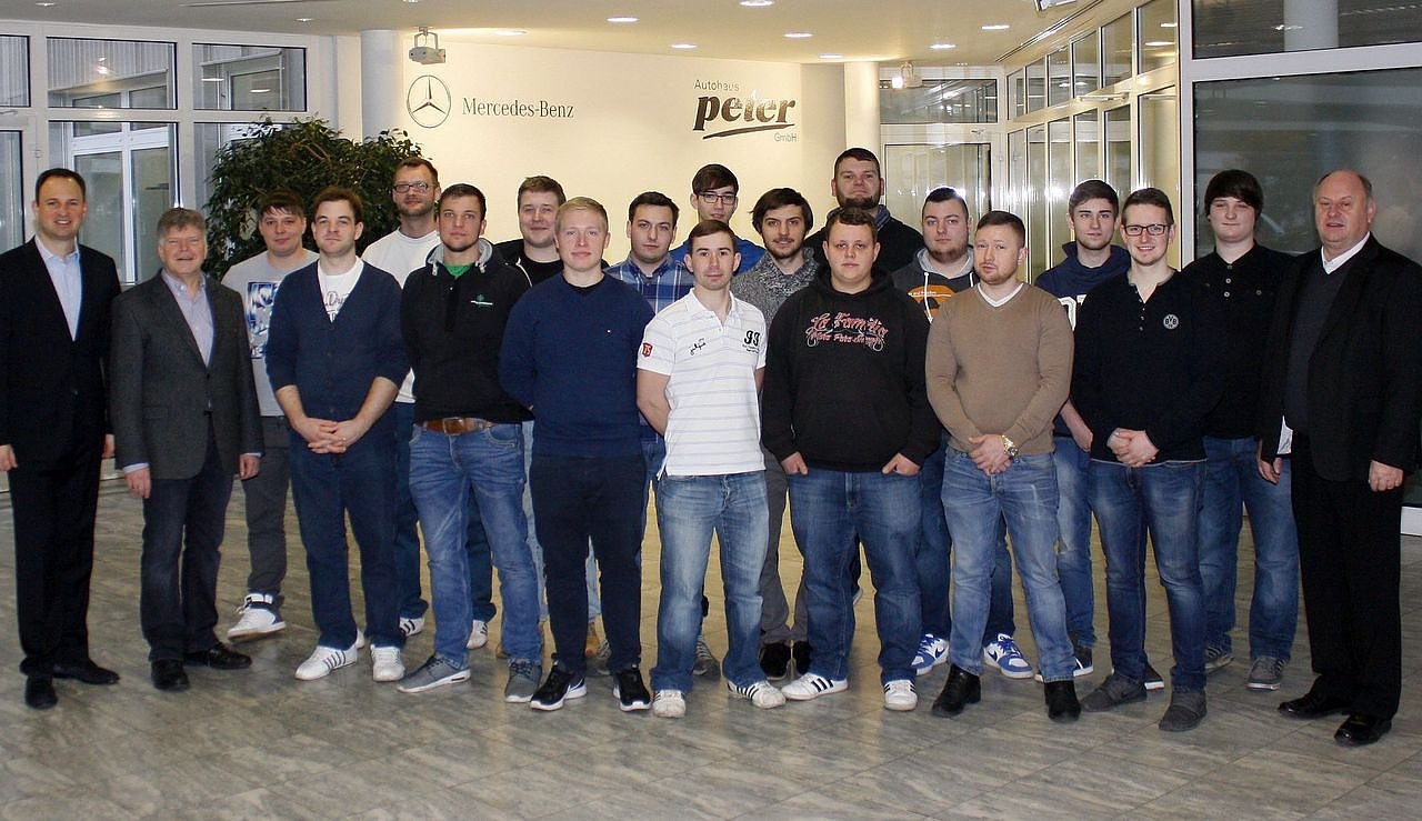 Flankiert von den Geschäftsführern Andreas und Helmut Peter, stellten sich die 17 Gesellen des Kfz-Handwerks zum Gruppenfoto auf.