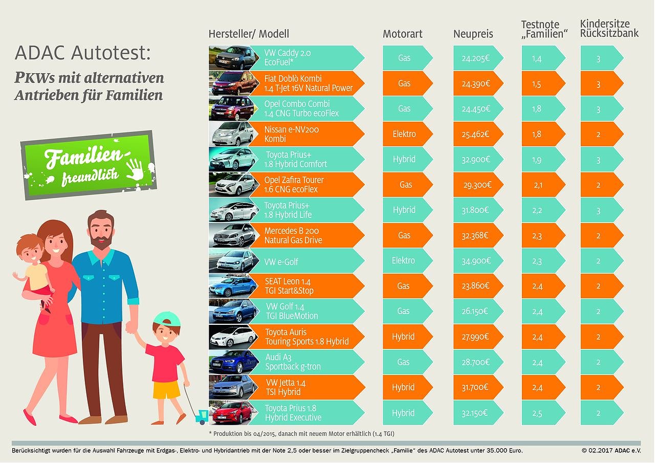 Berücksichtigt wurden bei dieser Auswahl Fahrzeuge mit Erdgas-, Elektro- und Hybridantrieb mit der Note 2,5 oder besser im Zielgruppencheck Familie des ADAC Autotests unter 35.000 Euro. Alle getesteten Autos gibt es unter adac.de/autotest.