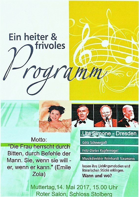 Autor: mshIn diesem Gedanken Emilie Zolas steckt doch eine tiefe Verneigung vor dem Zusammenleben von Mann und Frau. Drei Herren und ein Mann (manchmal auch eine Frau) verneigen sich mit und haben ihr neuestes Programm mit viel Musik und einigen Texten so gestaltet, dass die Achtung vor dem anderen Geschlecht auf humorvolle Weise immer gewahrt bleibt. Die bekannten Titel aus Operetten und Tonfilmen laden ein zum Mitsummen und zum entspannten Konzerterlebnis. "Es ist uns gelungen, die bekannte Dresdener Sopranistin Uta Simone als Stargast in unser Programm einzubinden",heißt es in einer Pressemitteilung.