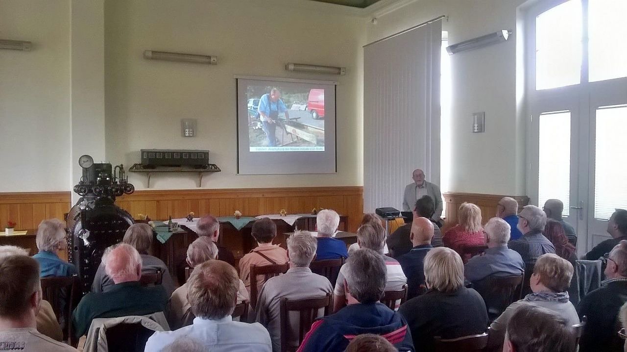 Bis auf den letzten Stuhl besetzt war der historische Wartesaal im Bahnhof Klostermansfeld in Benndorf. Der Verein Mansfelder Bergwerksbahn hatte zu einem Vortrag über die Elektrische Kleinbahn im Mansfelder Bergrevier geladen und 65 interessierte Besucher waren dieser gefolgt.