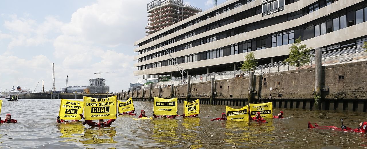 Klimaschutz heißt Kohleausstieg. Auf dem zweistöckigen Floß steht ein fünf Meter großes Modell eines Schaufelrads. Ein 34 mal 14 Meter großes Banner an der Fassade der in Sichtweite gelegenen Greenpeace-Zentrale zeigt eine herzförmige Weltkarte mit der Forderung Planet Earth First heißt Kohleausstieg.