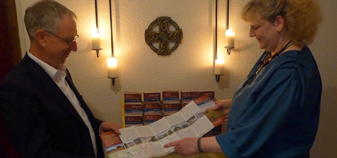 Die Geopark-Faltblätter liegen seit kurzem auch im Gasthaus Zur Queste in Questenberg in der Gemeinde Südharz aus. Auf dem Bild: Geoparkleiter Dr. Klaus George und Gastwirtin Liane Gast. (Foto: RVH)