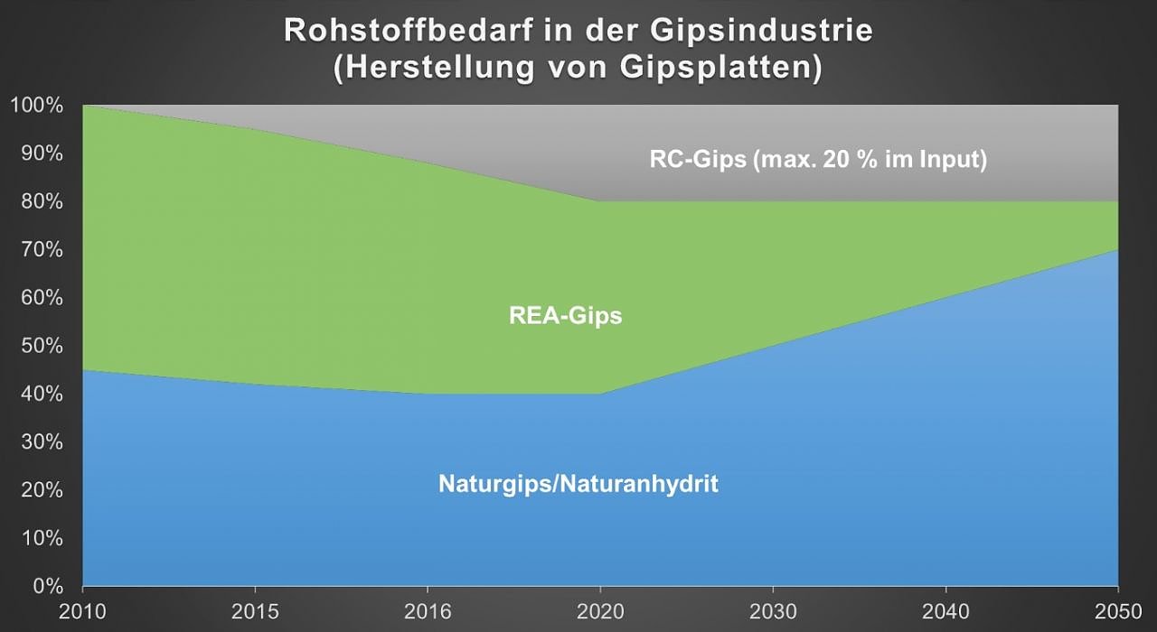 Diese Grafik beschreibt die Ausgangssituation: Wenn bis zum Jahr 2050 auch weiterhin auf Gips als Baustoff gesetzt werden muss, dann kommt die Wirtschaft bei Beibehaltung der jährlichen Herstellungsmenge um die Ausweitung des Rohstoffabbaus nicht umhin. Moderat werde zwar der Einsatz von Recyclinggips zunehmen, allerdings werde der Anfall von Rea-Gips aus Kohleheizkraftwerken auf nahezu Null zurückgehen. Interessenten müssten dazu nur die aktuellen Sonderierungs-Diskussionen in Berlin verfolgen.