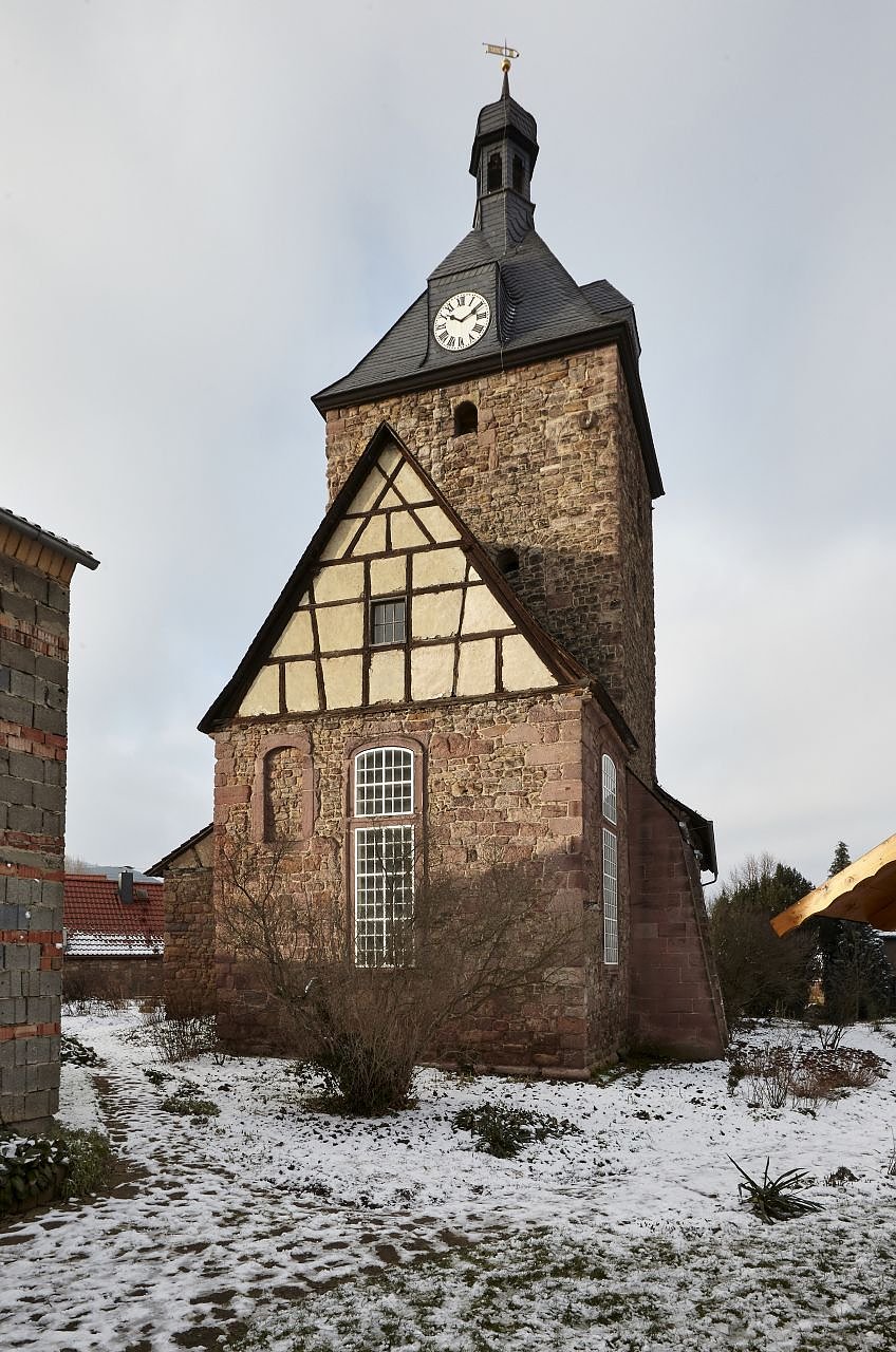 Autor: mshAm Nordrand des Kyffhäusers in der Ortsmitte vom Tilleda befindet sich die Dorfkirche St. Salvator. Der fast quadratische Turm der bruchsteinernen Chorturmkirche stammt vermutlich aus dem 12. Jahrhundert. Er schließt mit einem Zeltdach und einer Laterne ab. Im darauffolgenden Jahrhundert erhielt der romanische Bau den rechteckigen gotischen Chor mit Kreuzrippengewölbe. Nach einem Brand 1718 barockisierte man den Bau. So stammen der Altar, die Emporenbemalung und die Orgel von Johann Georg Papenius aus dieser Zeit. 1862 veränderte man den Innenraum erneut.