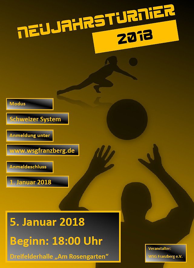 Zum Neujahrsturnier am 05.01.2018 ab 18:00 in der Dreifelderhalle in Sondershausen kann man sich noch anmelden. Aber Sie als Zuschauer sollten sich den Termin vormerken.
