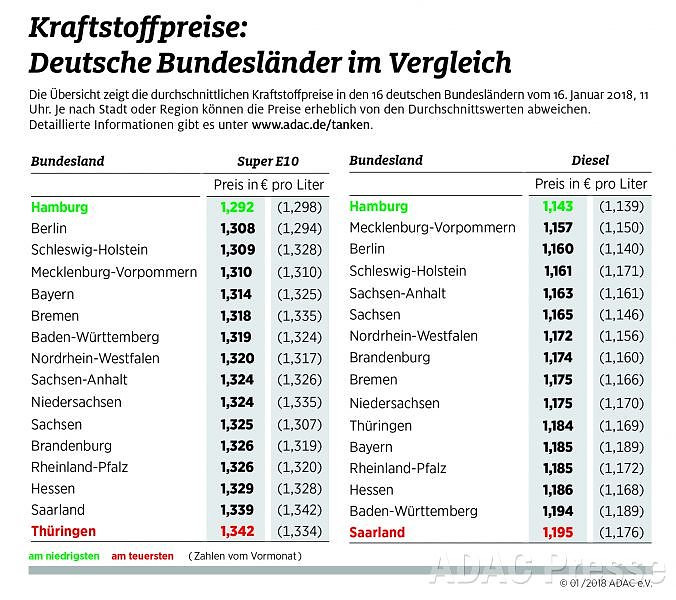 Mit Beginn des neuen Jahres bleibt eine Erkenntnis erhalten: Durch einen Preisvergleich beim Tanken lässt sich Geld sparen. An der Tanksäule freuen können sich die Hamburger, denn Benzin und Diesel sind hier im Bundesländervergleich am billigsten, teuer ist der Sprit hingegen für die Thüringer...