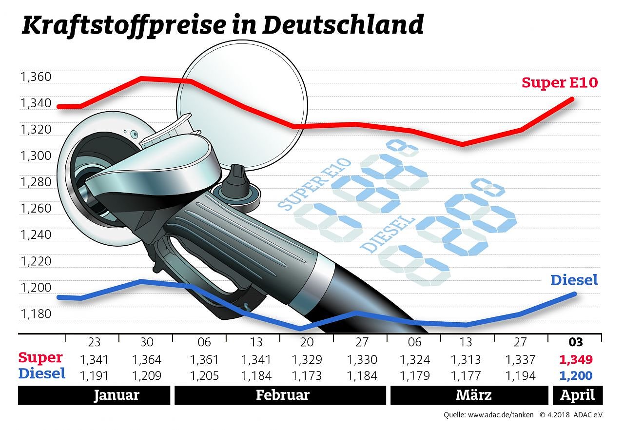 Die Autofahrer müssen beim Tanken erneut tiefer in die Tasche greifen. Laut aktueller Auswertung des ADAC kostet ein Liter Super E10 im bundesweiten Mittel derzeit 1,349 Euro. Im Vergleich zur Vorwoche ist dies ein Anstieg von 1,2 Cent. Dieselkraftstoff verteuerte sich um 0,6 Cent und kostet derzeit im Schnitt 1,200 Euro...