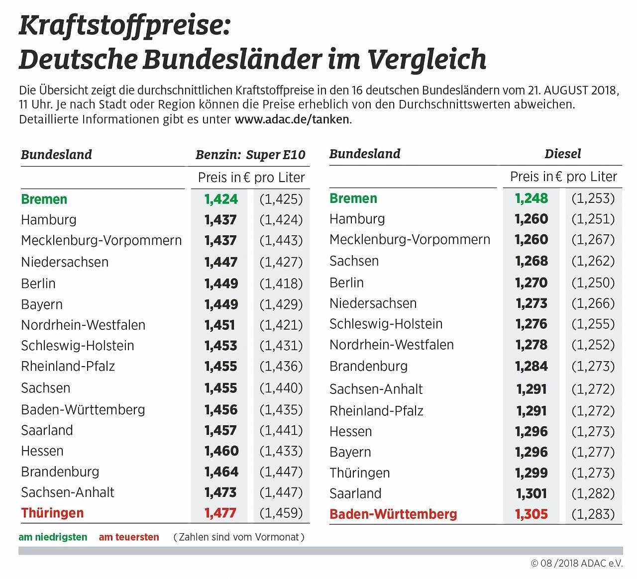 Am billigsten tankt man im Stadtstaat Bremen, das den bisherigen Spitzenreiter Berlin von Platz eins verdrängt hat. Dort liegt der Preis für einen Liter Super E10 bei 1,424 Euro und damit um 1,3 Cent niedriger als bei den Zweitplatzierten Hamburg und Mecklenburg-Vorpommern. Diesel kostet in Bremen 1,248 Euro – dies sind 1,2 Cent weniger als in Hamburg und Mecklenburg-Vorpommern. Damit beträgt die Preisdifferenz zwischen dem teuersten und billigsten Bundesland im Moment 5,3 Cent bei Super E10 und 5,7 Cent bei Diesel.