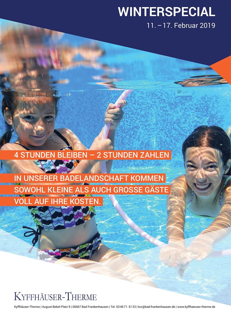 Am 12. Februar 2019 fand in der Kyffhäuser-Therme die Winter-Pool-Party statt. Viele Kinder machten in der Zeit von 13:00 bis 17:00 Uhr die Badelandschaft unsicher. Und es geht weiter...