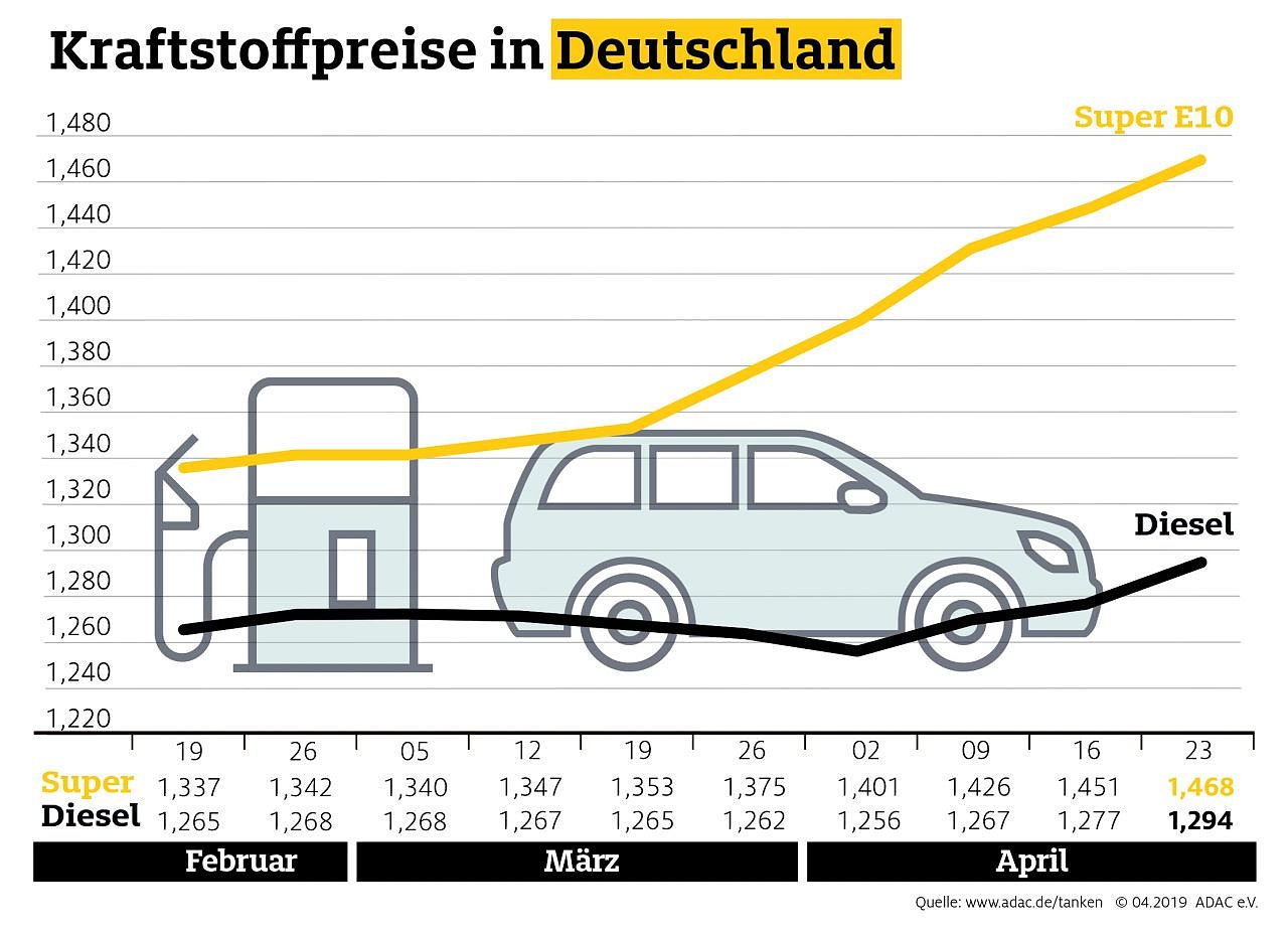 Seit Wochen kennen die Durchschnittspreise für Benzin und Diesel nur eine Richtung: nach oben. Diese Entwicklung setzt sich fort. Laut aktueller Auswertung des ADAC verteuerte sich ein Liter Super E10 im Bundesdurchschnitt um 1,7 Cent auf 1,468 Euro, für einen Liter Diesel müssen Autofahrer im Mittel 1,294 Euro bezahlen, ebenfalls 1,7 Cent mehr als in der Vorwoche...