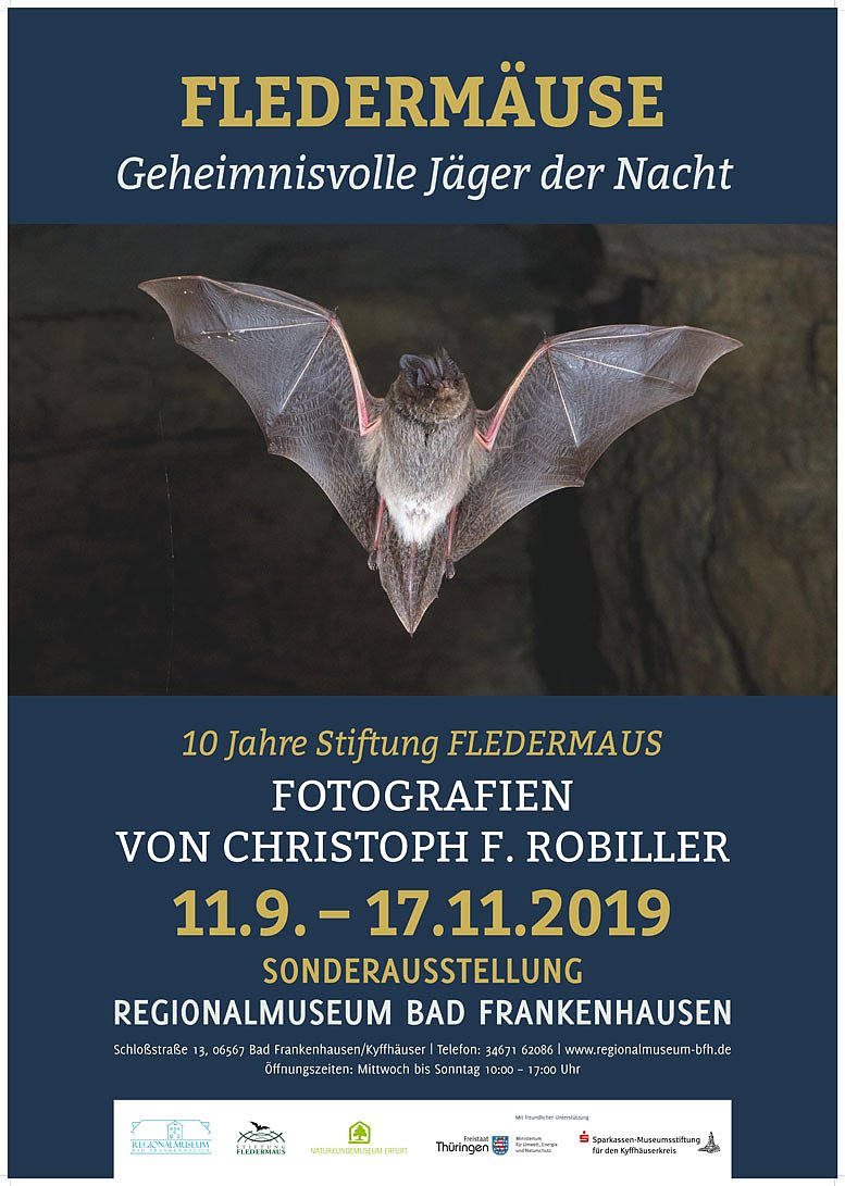 Anlässlich des zehnjährigen Jubiläums der Thüringer Stiftung FLEDERMAUS können wir in dieser Ausstellung, in Kooperation mit dem Naturkundemuseum Erfurt, exzellente Bilder und Filme des bekannten Naturfotografen Dr. Christoph Franz Robiller aus dem Leben der Fledermäuse zeigen.