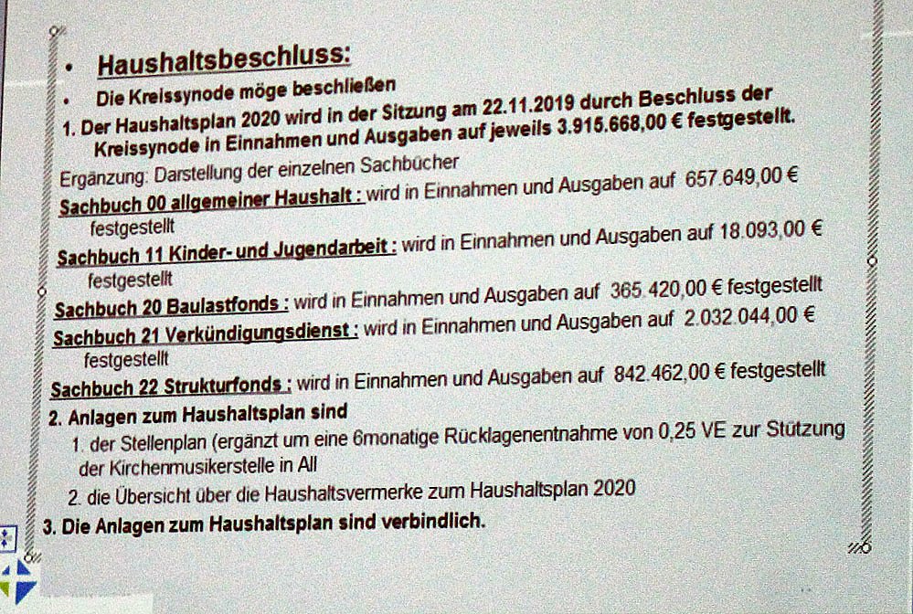 Zuerst ging es um den Haushaltsjahr 2020, mit dem Thema Haushalts- sowie Stellenplan und die Kirchenkreiskollekte für 2020.