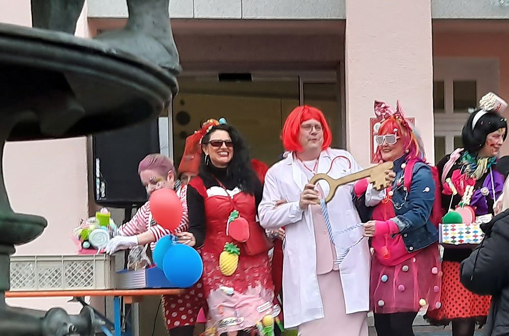 Tradition ist seit einiger Jahren, dass der Weiberfasching ab 17:07 Uhr zusammen vor dem Rathaus mit Bürgern und zu meist mit den Touristen gefeiert wird.