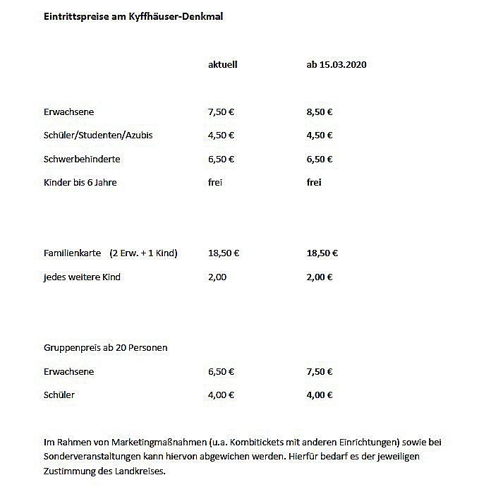 Autor: khhDer Kreisausschuss beschloss zum 15. März 2020 die Änderung der Eintrittspreise am Kyffhäuser-Denkmal entsprechend des Vorschlags laut Anlage 1.
