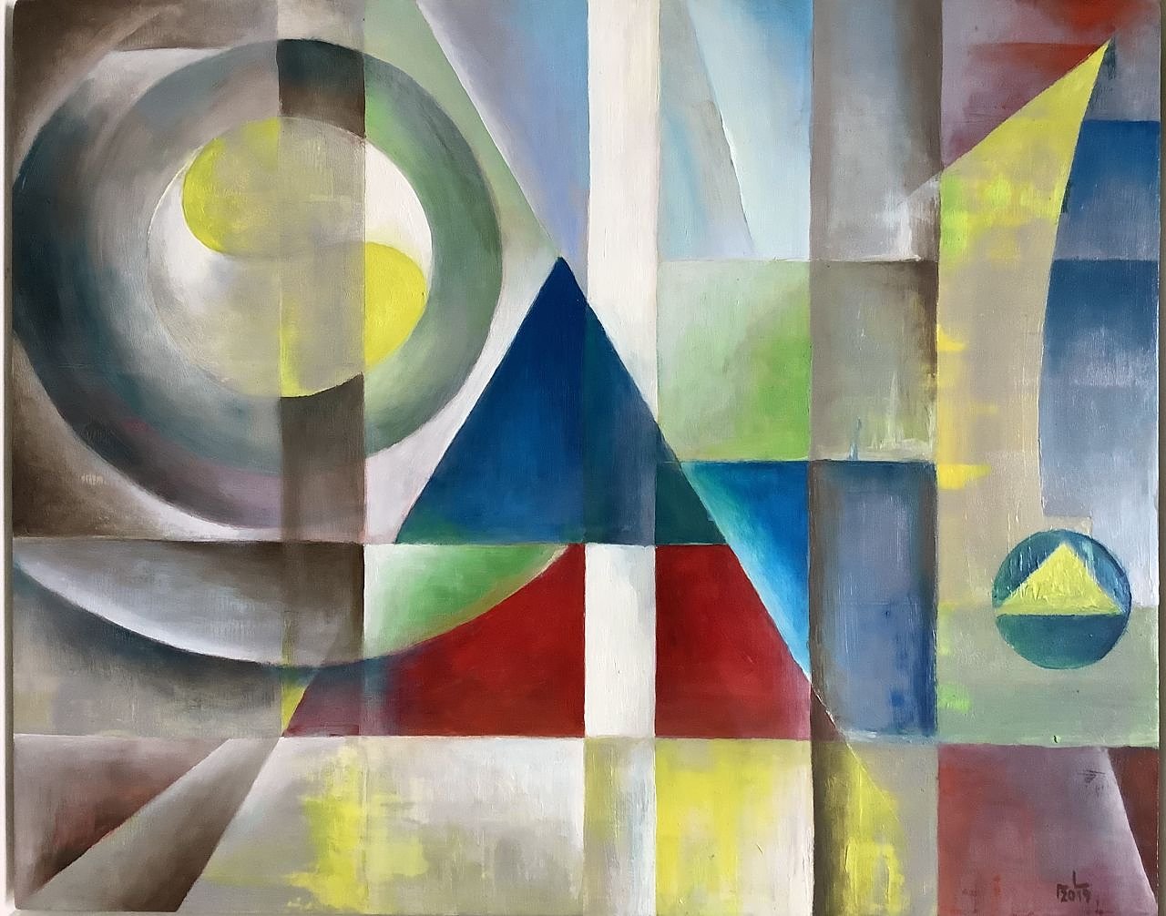 Am Beginn hatten sie unterschiedlich große Elementarformen wie Dreieck, Rechteck (Quadrat) und Kreis zu einer Komposition zusammenzufügen. Diese wurden aus Papier ausgeschnitten und auf einem weißen Blatt unterschiedlich positioniert. Aufgabe war es nun die Ausdruckswerte der jeweiligen Komposition zu diskutieren. Dabei spielten Aspekte von Dynamik und Statik eine große Rolle, aber auch ganz individuelle Assoziationen stellten sich ein, wie Verlorenheit oder Enge und Bedrängnis. Erst dann wurde eine gelungene Komposition auf die Leinwand übertragen und farblich ausgedeutet, wobei beim Farbauftrag durchaus experimentell agiert werden sollte. Grundsätzlich bestand aber die Orientierung, dass die Elementarformen bevorzugt mit klaren Grundfarben wie Gelb, Rot und Blau ausgedeutet werden sollten. Und damit begannen die Schwierigkeiten. Wie bettet man einen gelben Kreis in einen erdig-braunen Kontext ein, so dass er das Bildgefüge nicht zersprengt? Entweder man ändert die Größe des Details mit viel Einfühlungsvermögen, was aber zugleich das Kompositionsgefüge verändern würde oder man ändert die Intensität des Gelbtons so, dass der Kontrast weniger stark ist und das Farbgefüge miteinander harmonisiert. Auch das bedarf einer großen Farbsensibilität, die manche KursteilnehmerInnen erst noch zu entwickeln hatten. Folglich reichte ein Semester allein nicht aus, um überzeugende Kompositionen zu entwickeln. So wurde an ihnen noch im Frühjahrssemester 2019, also im Bauhausjubiläumsjahr, intensiv gearbeitet.