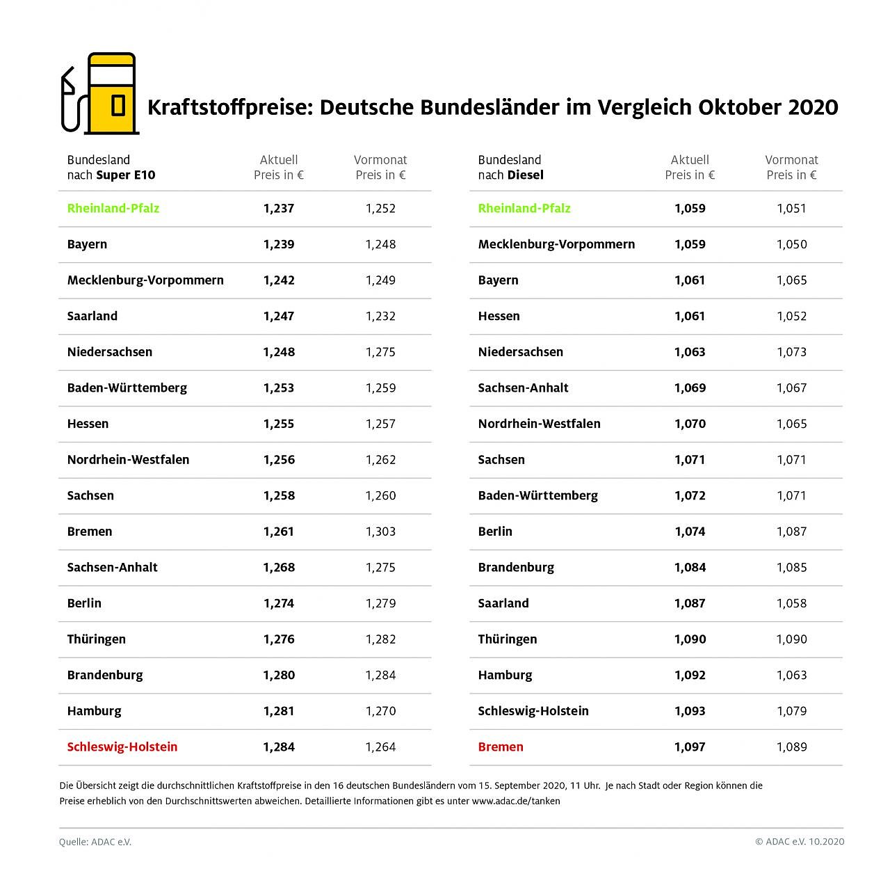 Autor: red...zwischen dem günstigsten Bundesland (Rheinland-Pfalz) und dem teuersten (Schleswig-Holstein). Ein Liter Super E10 kostet in Rheinland-Pfalz im Schnitt 1,237 Euro, im nördlichsten Bundesland fallen für einen Liter Super E10 aktuell 1,284 Euro an. Nur wenig günstiger ist Benzin in Hamburg, wo man für einen Liter 1,281 Euro bezahlen muss. Fast so preiswert wie in Rheinland-Pfalz können Autofahrer aktuell in Bayern tanken. Ein Liter Super E10 kostet dort im Durchschnitt 1.239 Euro.