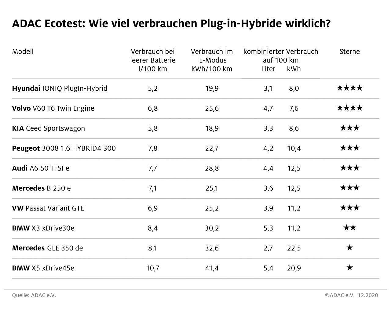 Der ADAC hatte drei Nutzungsszenarien untersucht: Die elektrische Fahrt mit ausreichend geladener Batterie, die Fahrt mit dem Verbrennungsmotor und ein gemischter Betrieb, bei welchem die Batterie alle 100 km geladen wird. Spitzenreiter Hyundai punktet mit seiner aerodynamischen Karosserie über alle drei Szenarien hinweg. Der Volvo V60 T6, der ebenfalls vier Sterne erhält, verbraucht mit seinem hohen Gewicht etwas mehr.