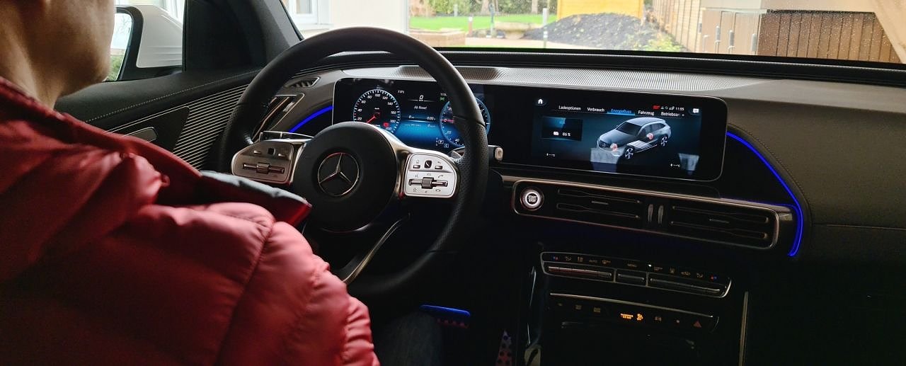 Äußerlich und auch im Innenraum war kein wesentlicher Unterschied zu einem konventionellen Mercedes der gleichen technischen Plattform, wie zum Beispiel dem GLC festzustellen. Was allerdings nicht zu entdecken war, die herkömmliche Tankanzeige. Aber die wird ja jetzt nicht mehr benötigt. Stattdessen, der noch verfügbare Strom als Prozentangabe und die Reichweite in km.