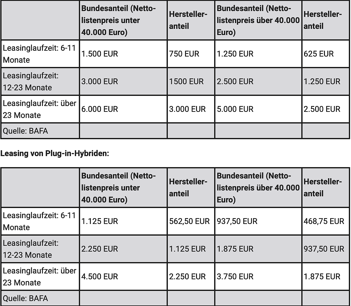 Käufer von neuen Pkw mit Elektroantrieb (BEV) oder Brennstoffzelle unter 40.000 Euro Nettolistenpreis erhalten einen Bundeszuschuss von 6.000 Euro, der vom Hersteller um 3000 Euro aufgestockt wird, insgesamt 9000 Euro. Bei BEV oder Brennstoffzelle bis 65.000 Nettolistenpreise zahlt der Bund 5.000 Euro, der Hersteller 2500 Euro, was eine Gesamtprämie von 7500 Euro ergibt.
